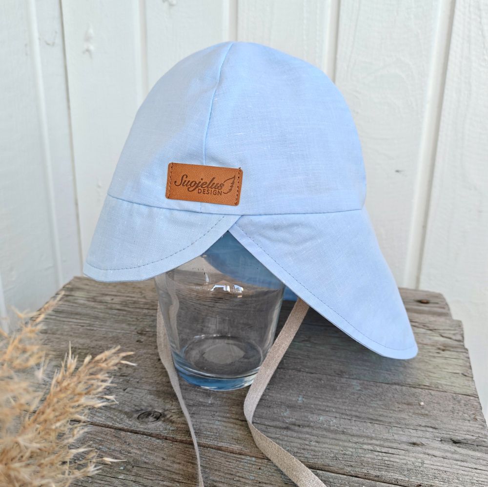 ENNAKKOTILAUS 22.4. saakka. Kaunis vaaleansininen hellehattu lapselle lipalla, jonka lippa edessä ja takana suojaa kasvoja ja niskaa auringolta. Kevyt ja mukava kesähattu.